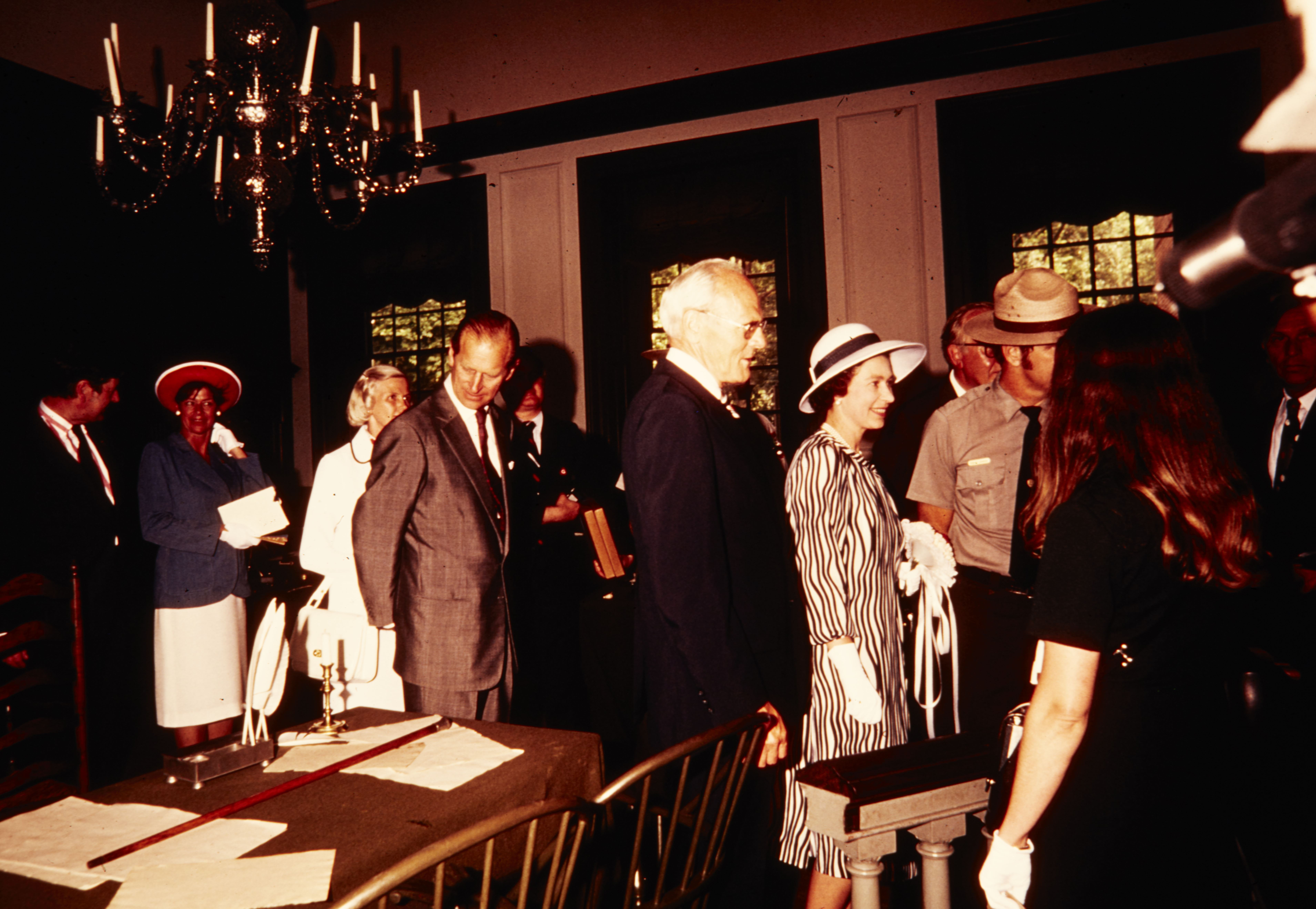 Queen Elizabeth II of United Kingdom walking through a building during her visit to Independence National Historical Park.