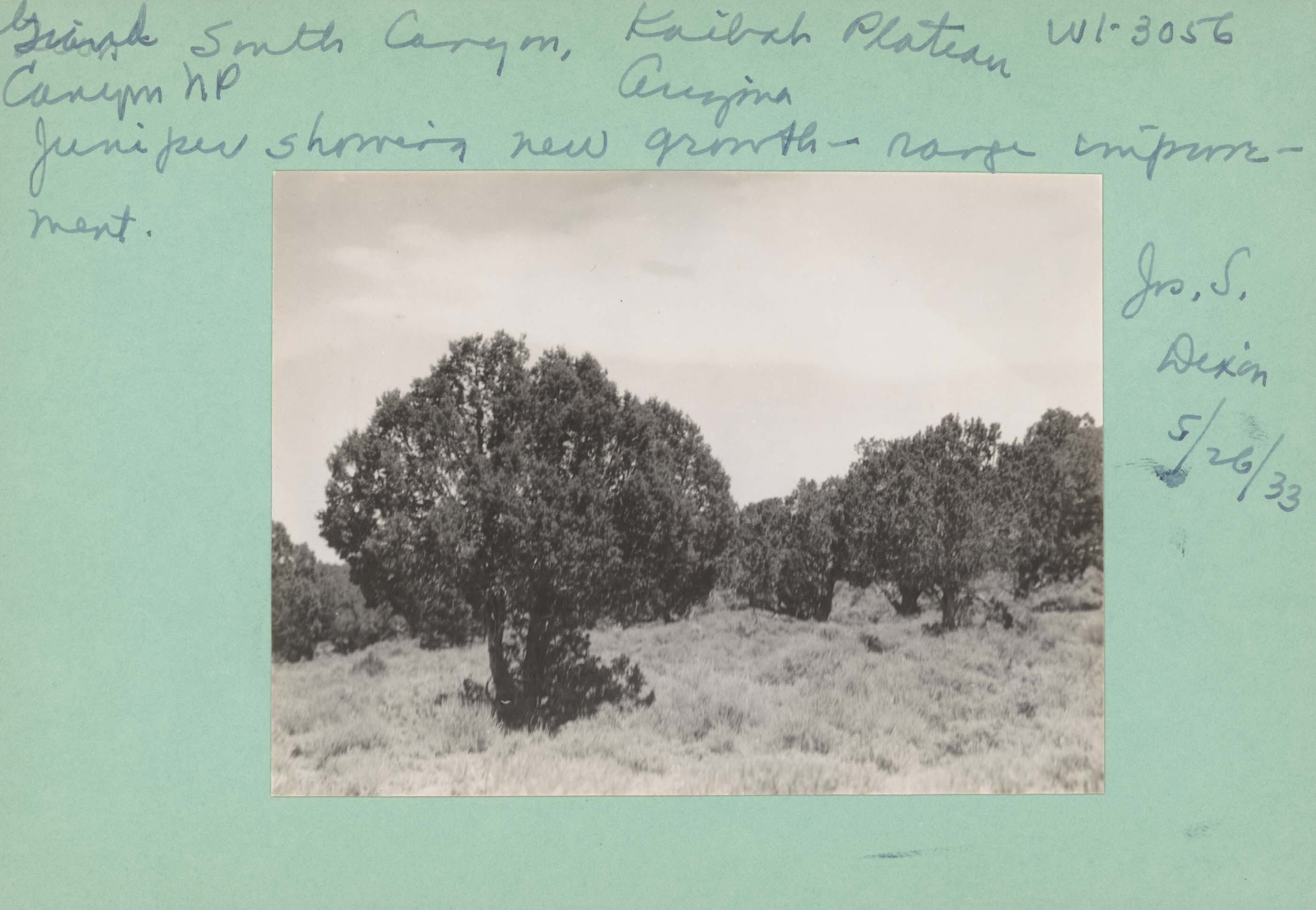 Juniper showing new growth – range improvement. Negative #: 3056. Locality: Grand Canyon, Smith Canyon, Kaibab Plateau, Arizona.