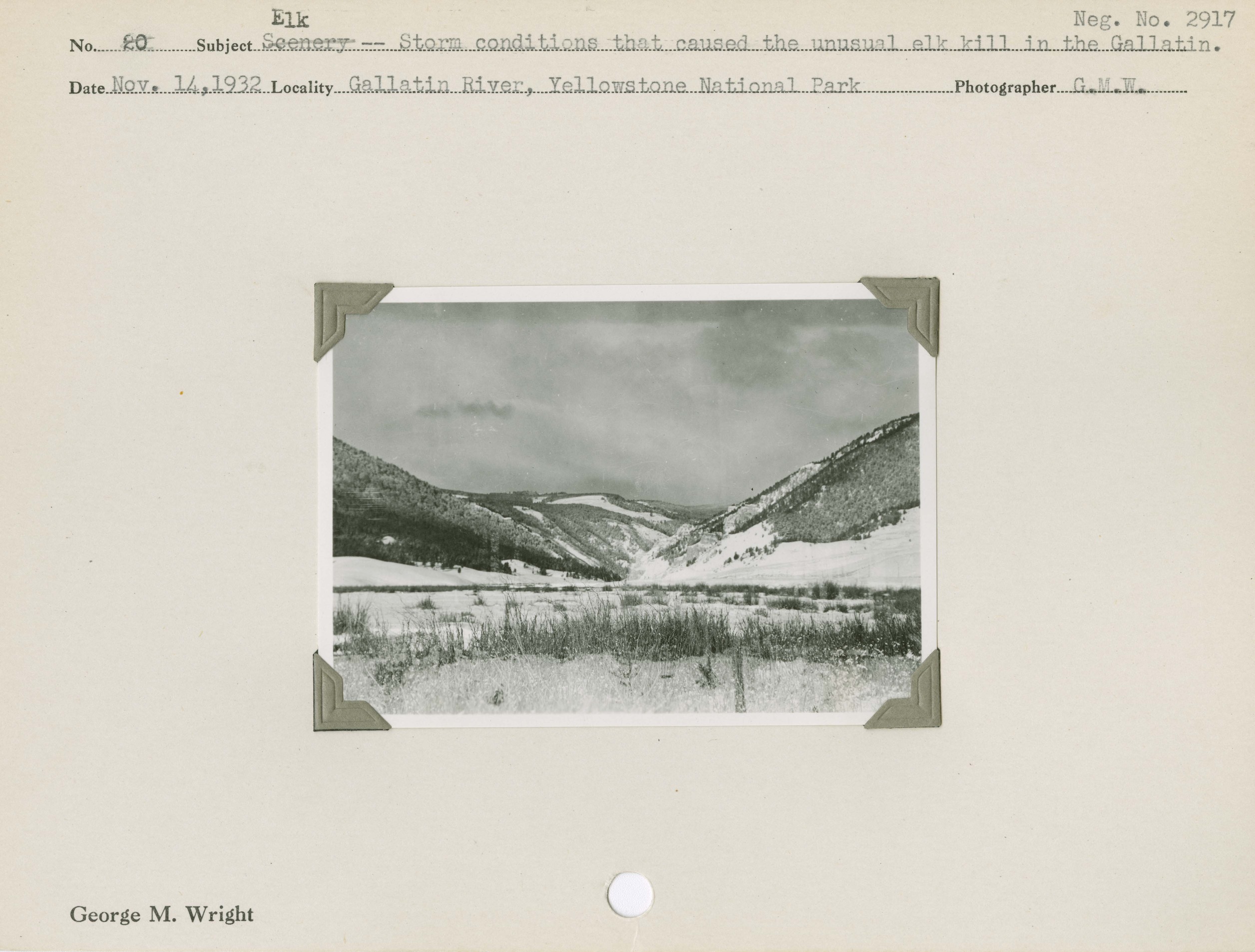 Wapiti, American [Elk]– Storm conditions that caused the unusual elk kill in the Gallatin. Negative #: 2917. Locality: Gallatin River, Yellowstone National Park.