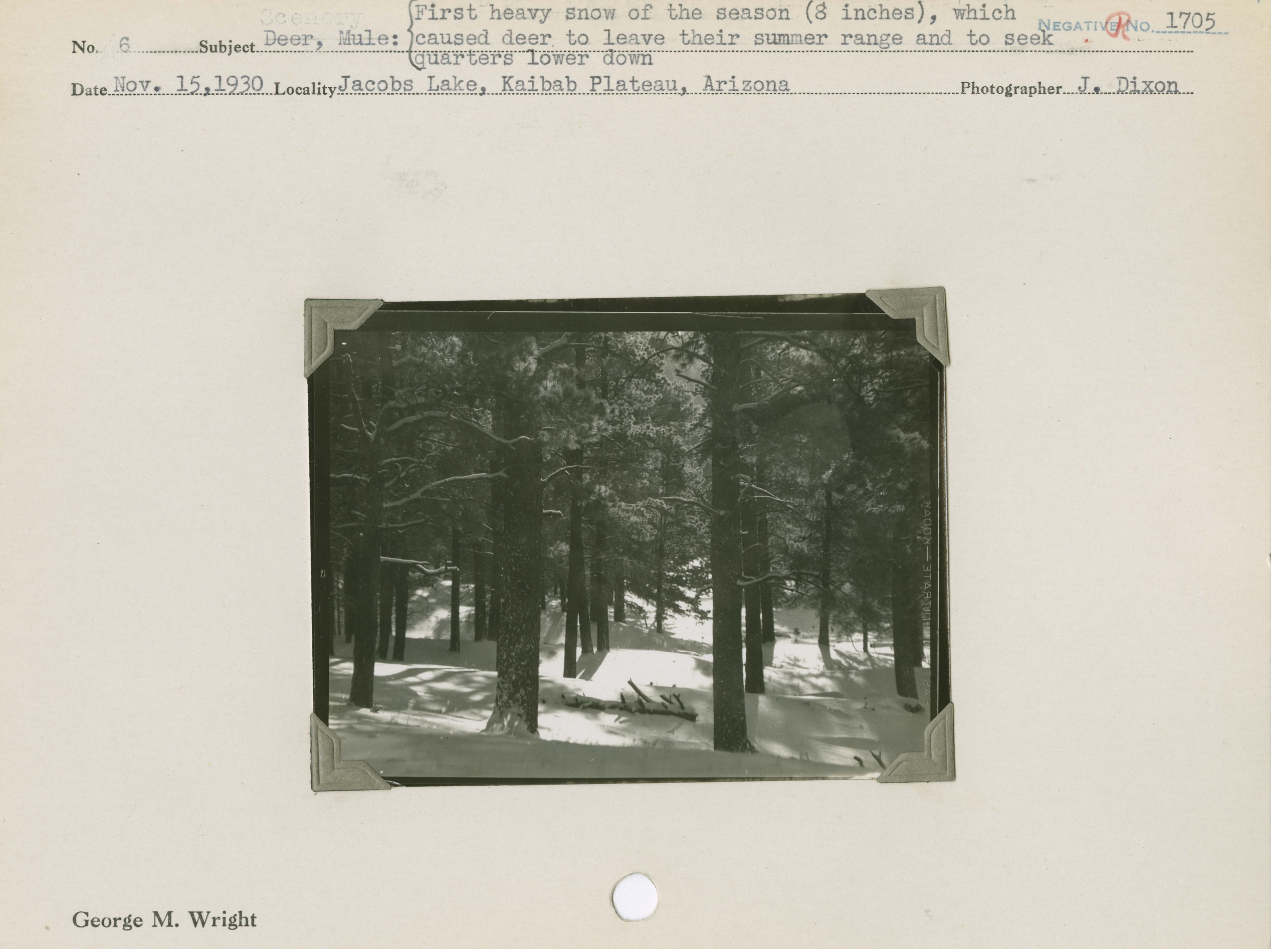 Deer, Mule – First heavy snow of the season (8 inches), which caused deer to leave their summer range and to seek quarters lower down. Negative #: 1705. Locality: Jacobs Lake, Kaibab Plateau, Arizona.