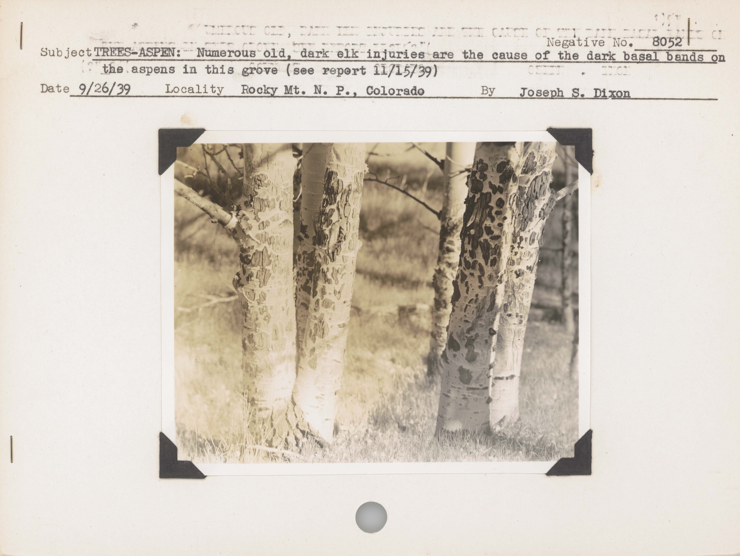 Tree – Aspen: Numerous old, dark elk injuries are the cause of the dark basal bands on the aspens in this grove (see report 11/15/39). Negative #: 8052. Locality: Rocky Mountain National Park, Colorado.