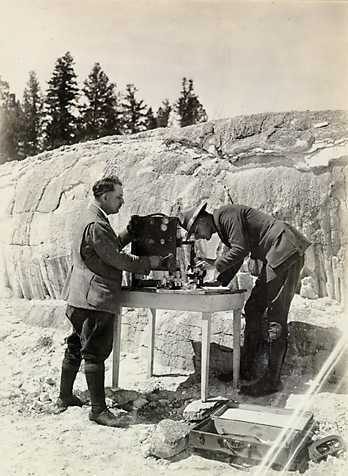 Moving pictures of algae. Professor Harvey of University of Minnesota and Park Naturalist Frank Thore studying (Environmental Impacts) plant life of thermal waters at Mammoth Hot Springs, Yellowstone National Park.