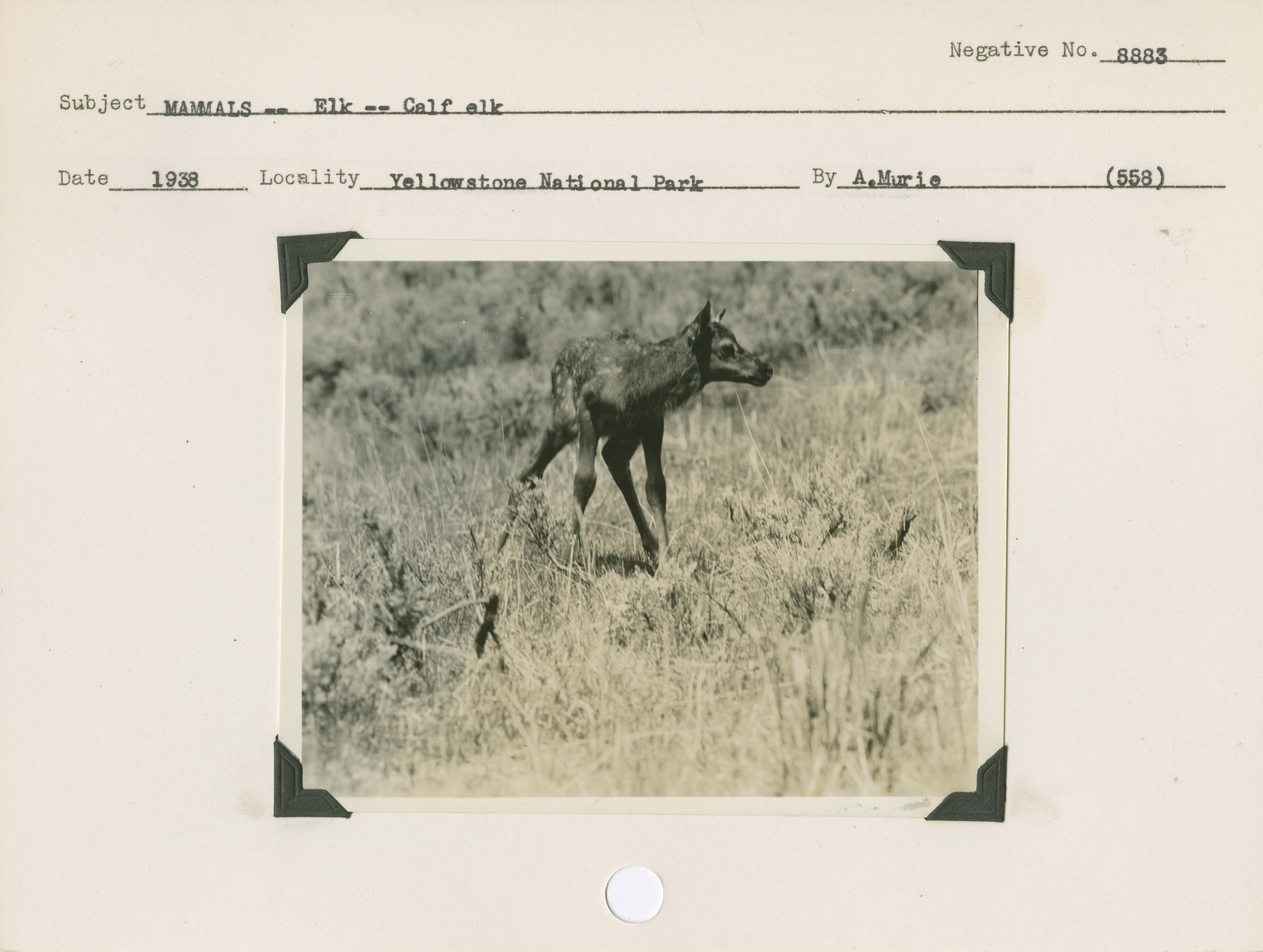 Elk – Elk calf. Negative #: 8883. Locality: Junction Butte, Yellowstone National Park. Location of Negative: Region Four Headquarters. [Some of this information comes from the reverse of the envelope for this negative number.].