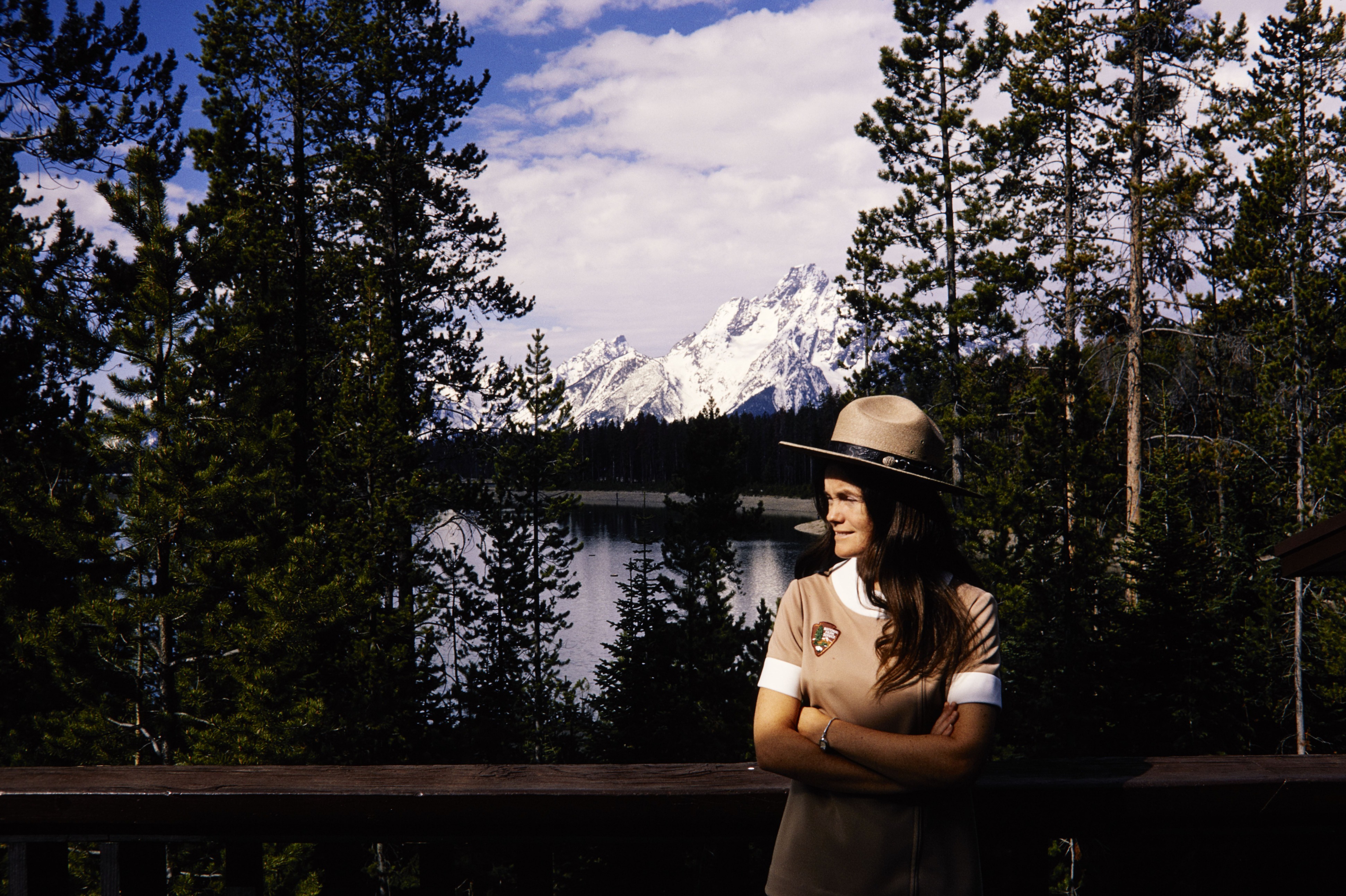 NPS employee standing in front of snow covered mountains in Grand Teton National Park.