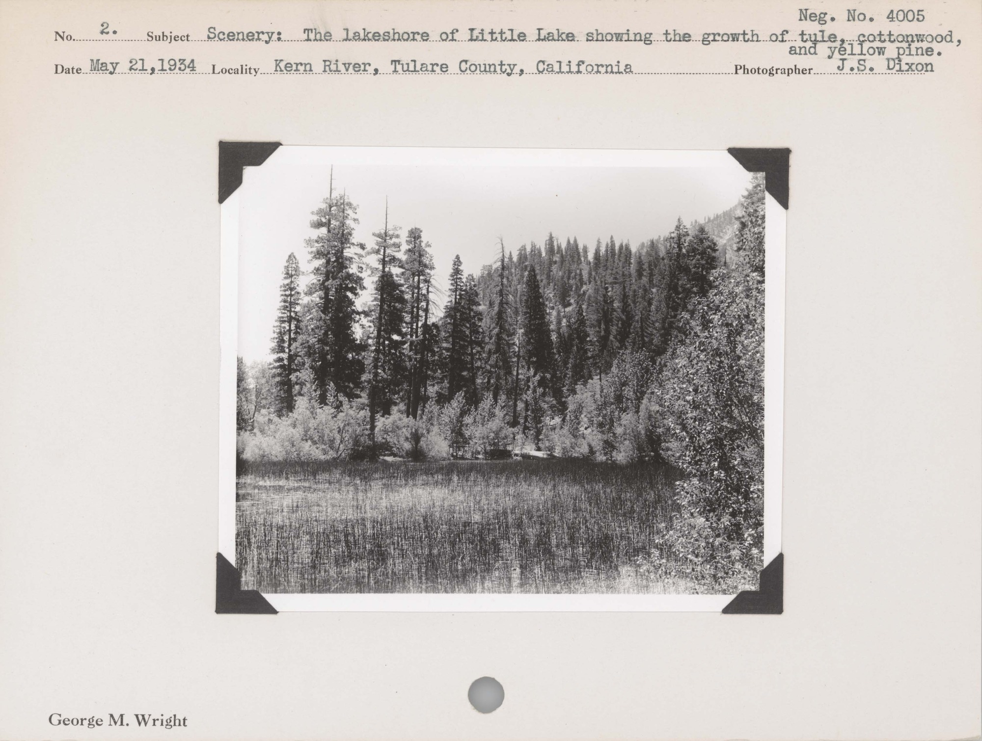 Scenery: The lakeshore of Little Lake showing growth of tule, cottonwood, and yellow pine. Negative #: 4005. Locality: Kern River, Tulare County, California.