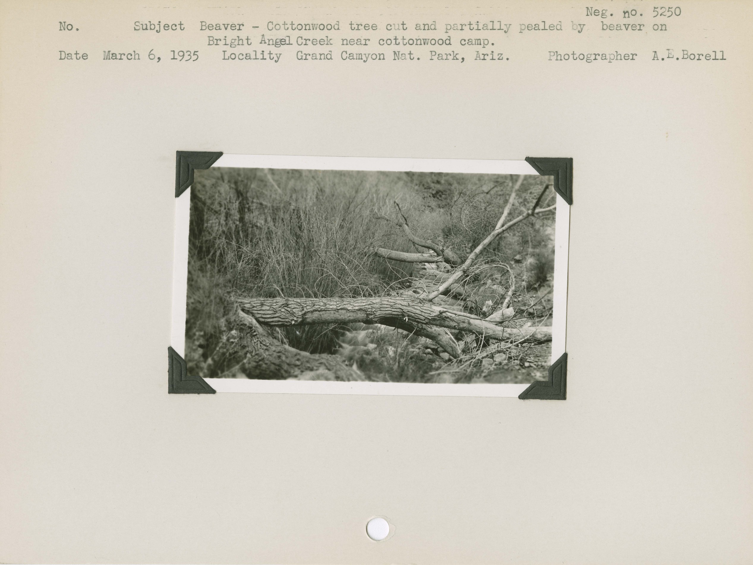 Beaver: Cottonwood tree cut and partially pealed by beaver on Bright Angel Creek near Cottonwood camp. Locality: Grand Canyon National Park, Arizona. Negative #: 5250.