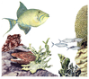 a Queen triggerfish, Star coral, Bar jack, Fire coral, and Elkhorn Coral, Moray eel