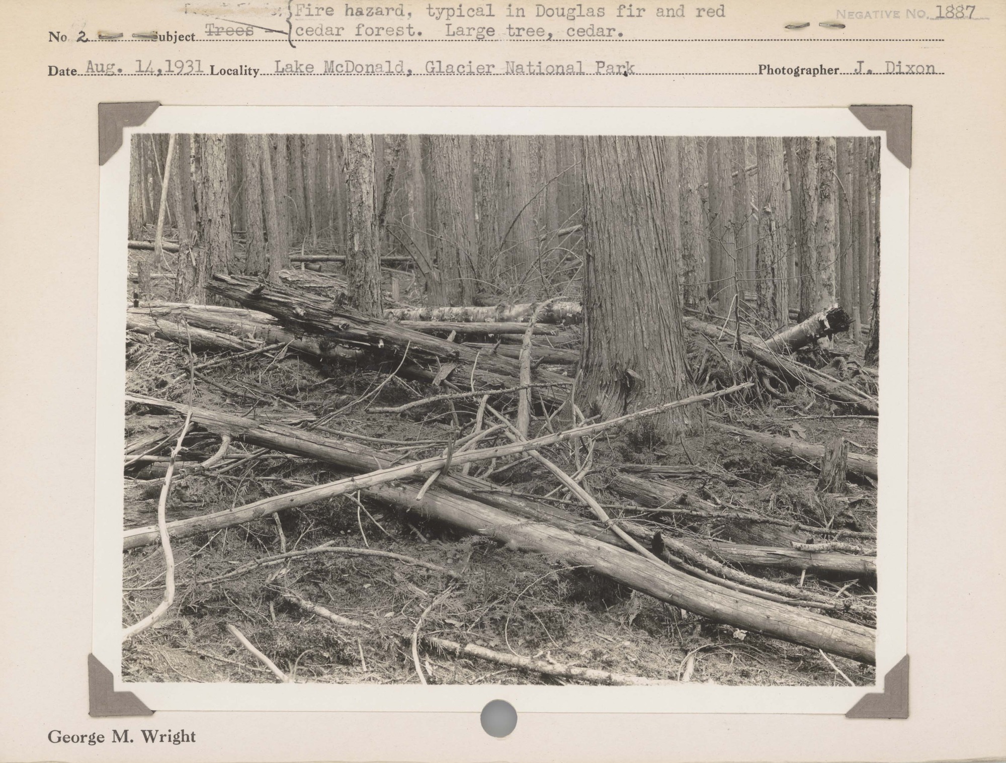 Fire hazard, typical in Douglas fir and red cedar forest. Large tree, cedar. Negative #: 1887. Locality: Lake McDonald, Glacier National Park.