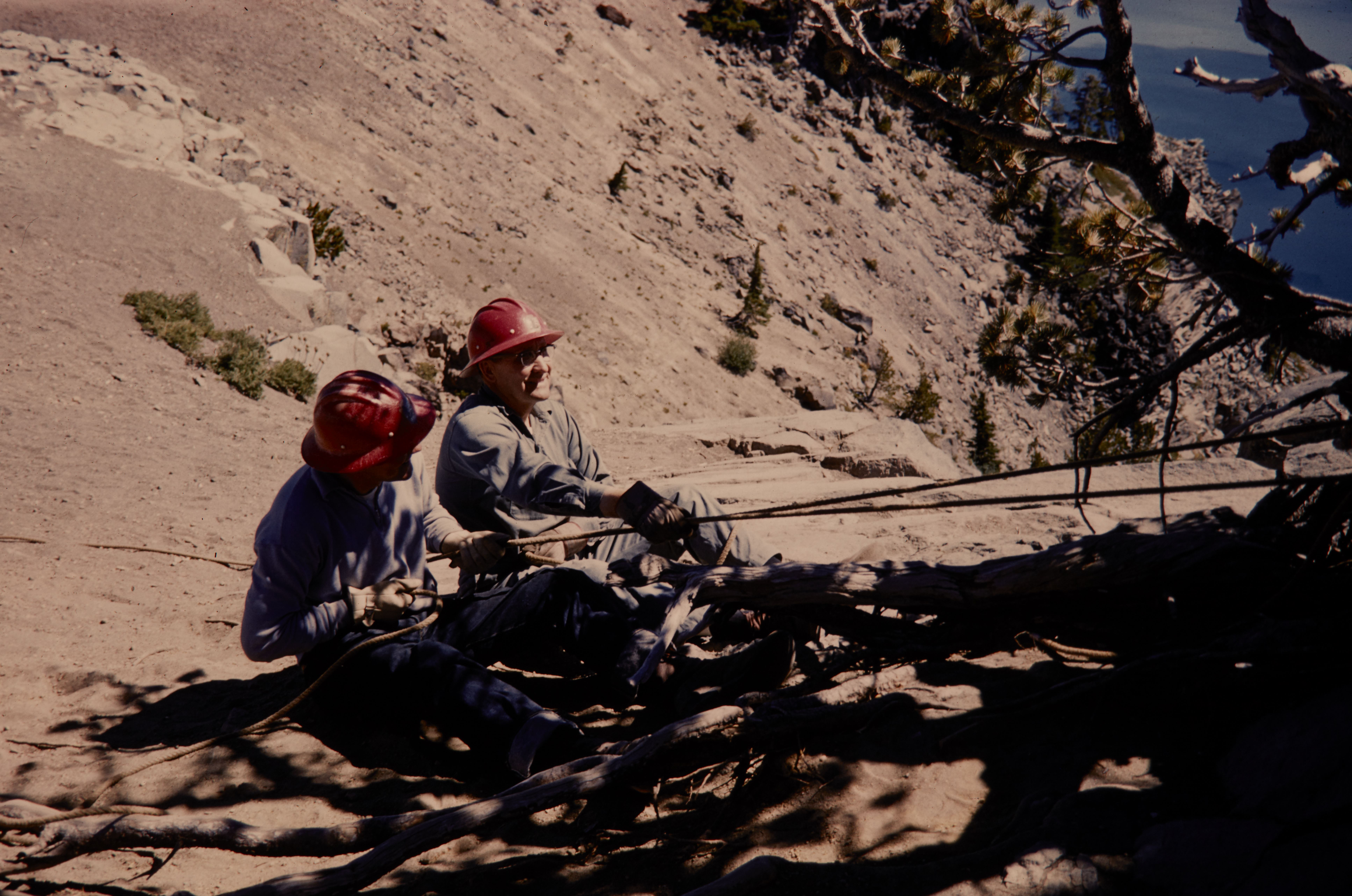 NPS Staff training to repell down a mountain using anchor men in Crater Lake National Park.