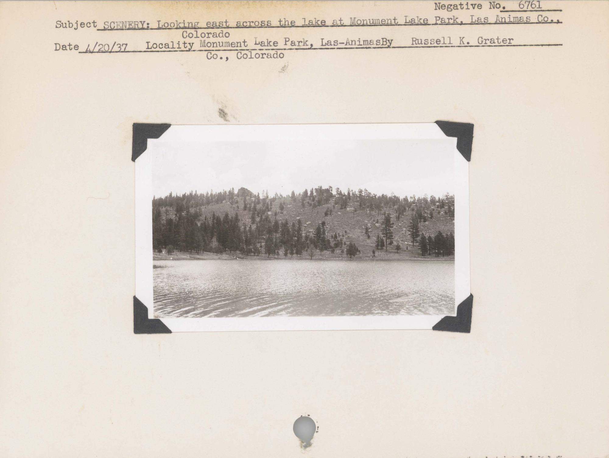 Scenery: Looking east across the lake at Monument Lake Park. Las Animas County, Colorado. Negative #: 6761. Locality: Monument Lake Park, Las-Animas County, Colorado.