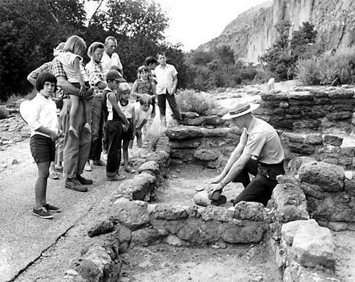 Ranger guided tour and demonstration of metate and mano at the Tyuonyi Ruins, Bandelier National Monument.