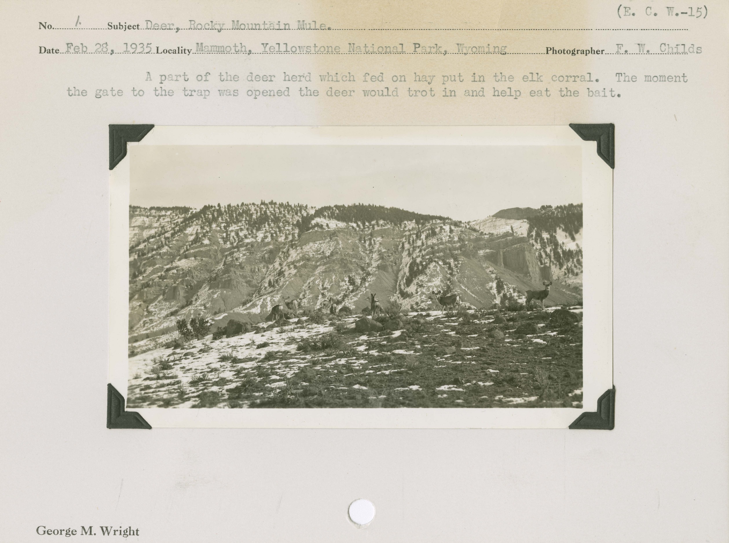 Deer, Rocky Mountain Mule. A part of the deer herd which fed on hay put in the elk corral. The moment the gate to the trap was opened the deer would trot in and help eat the bait. Emergency Conservation Work -15. Negative #: E.C.W.15. Locality: Mammoth, Yellowstone National Park.