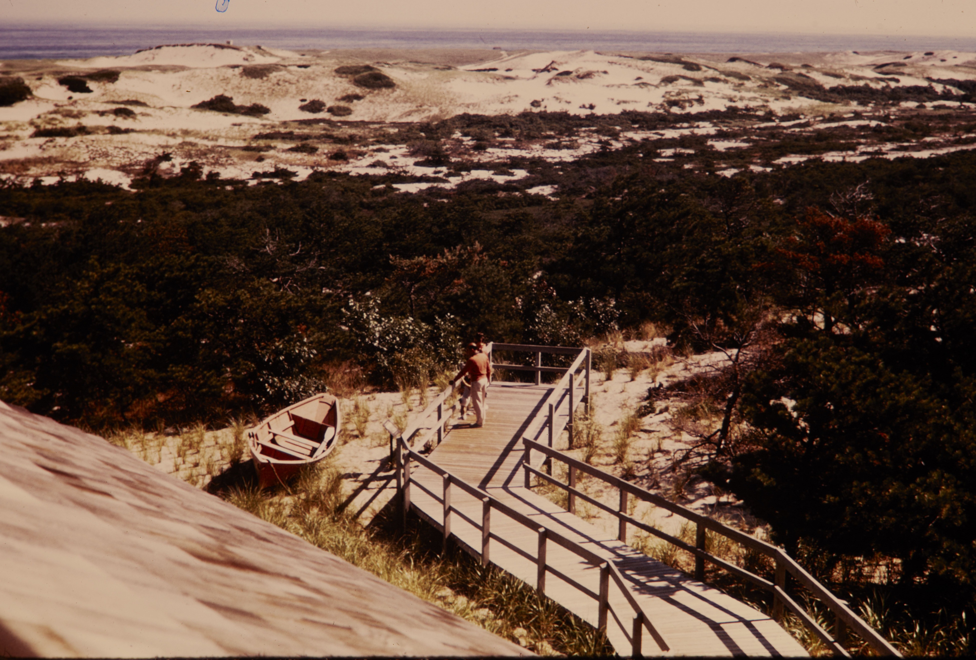 Visitors on the end of a boardwalk near a beach in Cape Cod National Seashore.