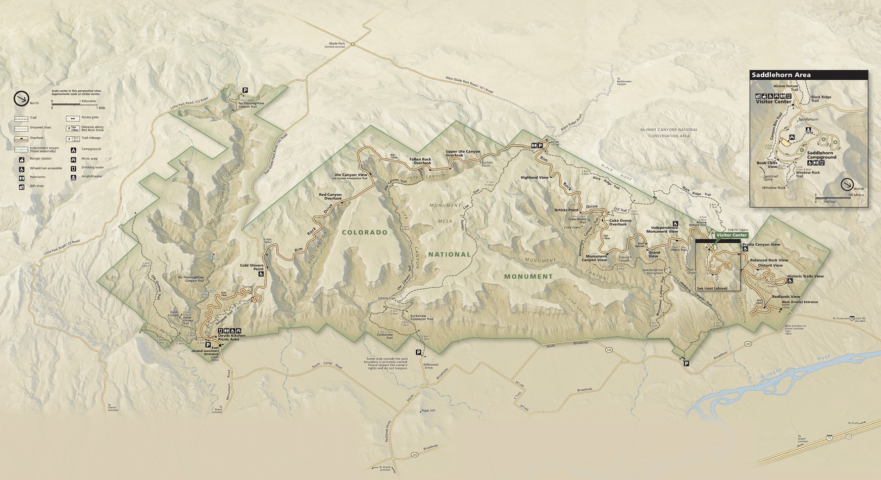 Map of Colorado National Monument in Colorado. The angular outline of the monument, which loosely resembles a teapot with the spout to the left, is green and the surrounding topography shades of tan and beige.