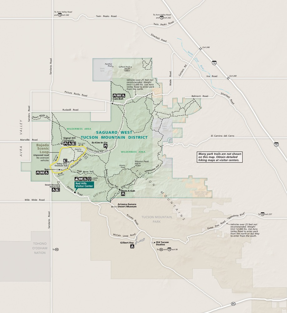 Map of Saguaro West Tucson Mountain District, the western unit of Saguaro National Park in Arizona. The park is roughly square but with boxy, deeply stepped edges. Park lands are shown in varying shades of pale green, and surrounding areas are tan.