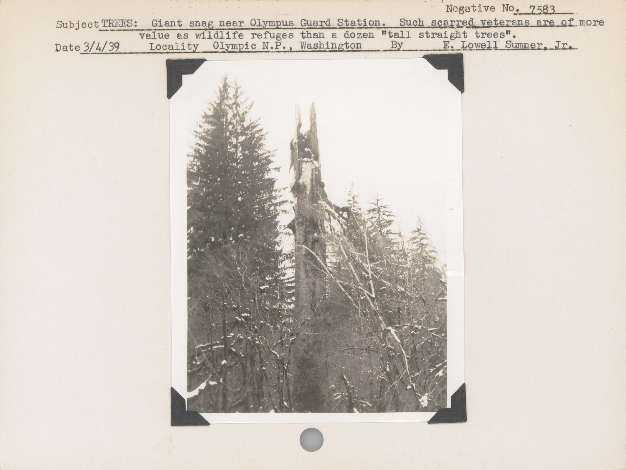Trees – Giant snag near Olympus Guard Station. Such scarred veterans are of more value as wildlife refuges than a dozen “tall straight trees”. Negative #: 7583. Locality: Olympic National Park, Washington.