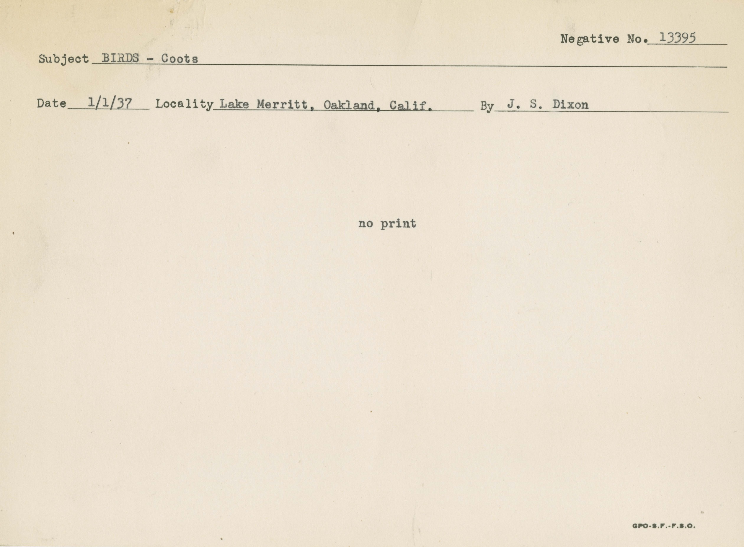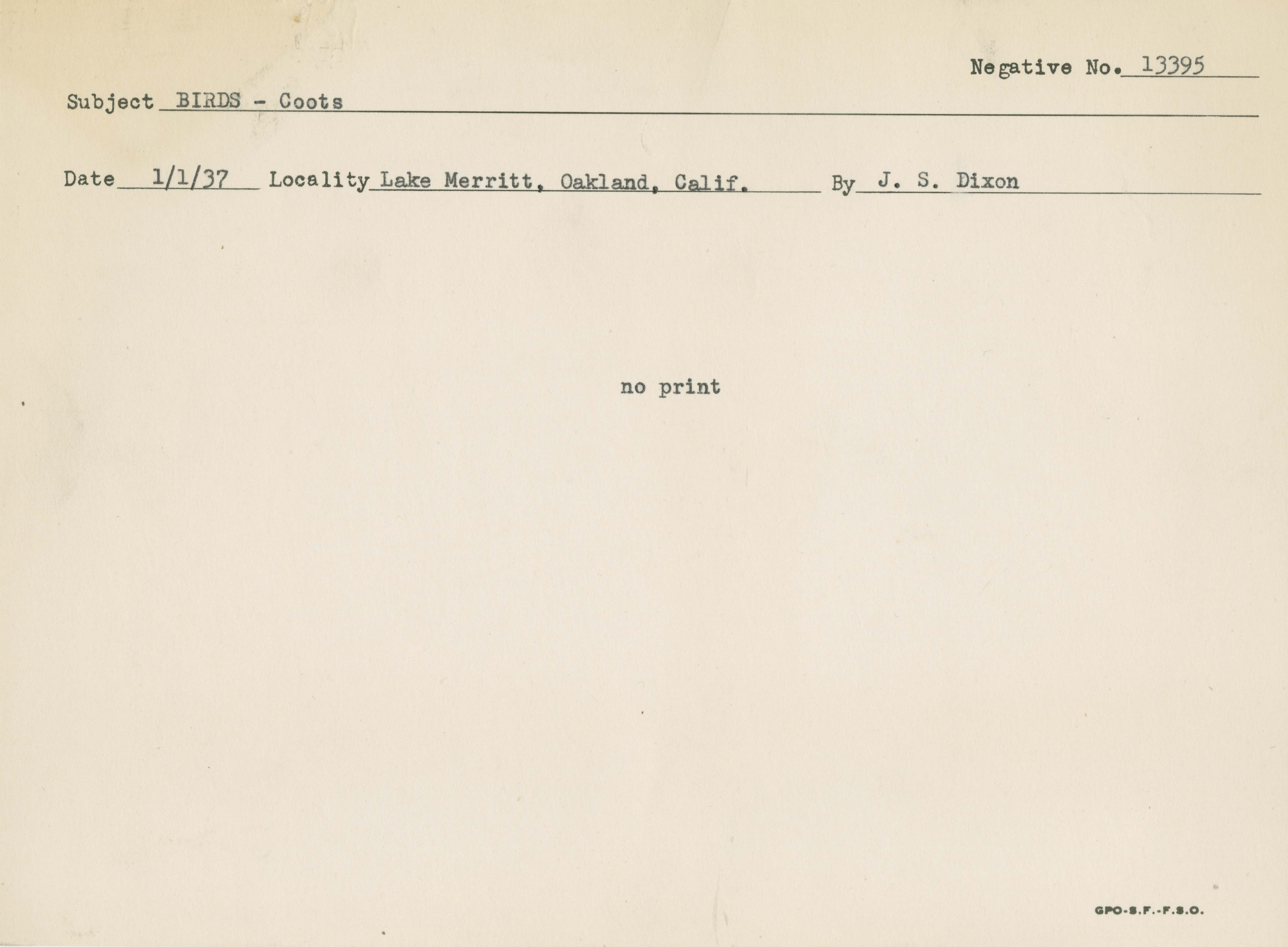 Birds - Coots. Locality: Lake Merritt, Oakland, California. Negative #: 13395. Photo card has no image.