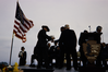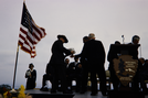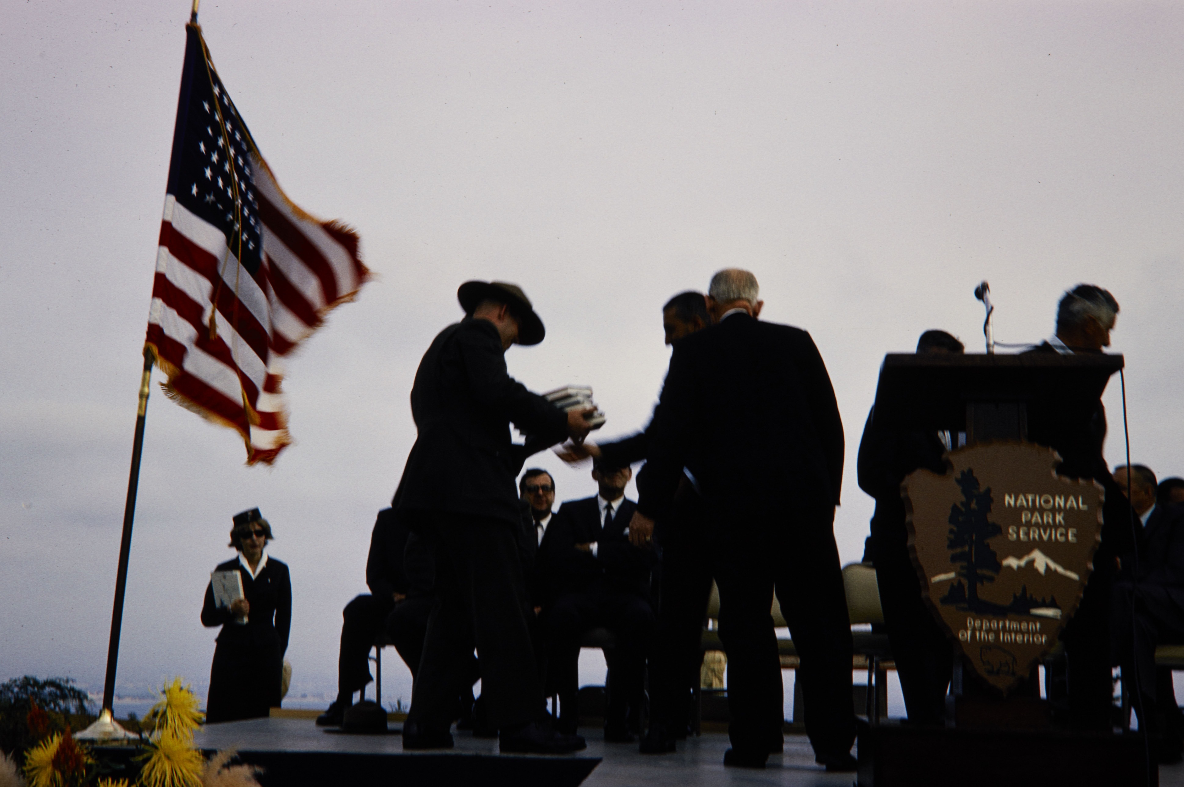 Ranger passing books to another man on stage with the NPS arrowhead on the microphone stand in Cabrillo National Monument.