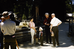 NPS director Horace Albright with an elderly woman and a small boy. Albright is also speaking with a man carryin a hat and water bottle. A park ranger and cameraman are observing the conversation taking place.