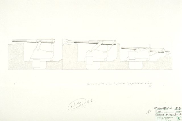 A three-part illustration depicts the various positions of a 10-inch disappearing rifle (gun) including 1) firing; 2) partway through recoil; and 3) fully recoiled and in the loading position