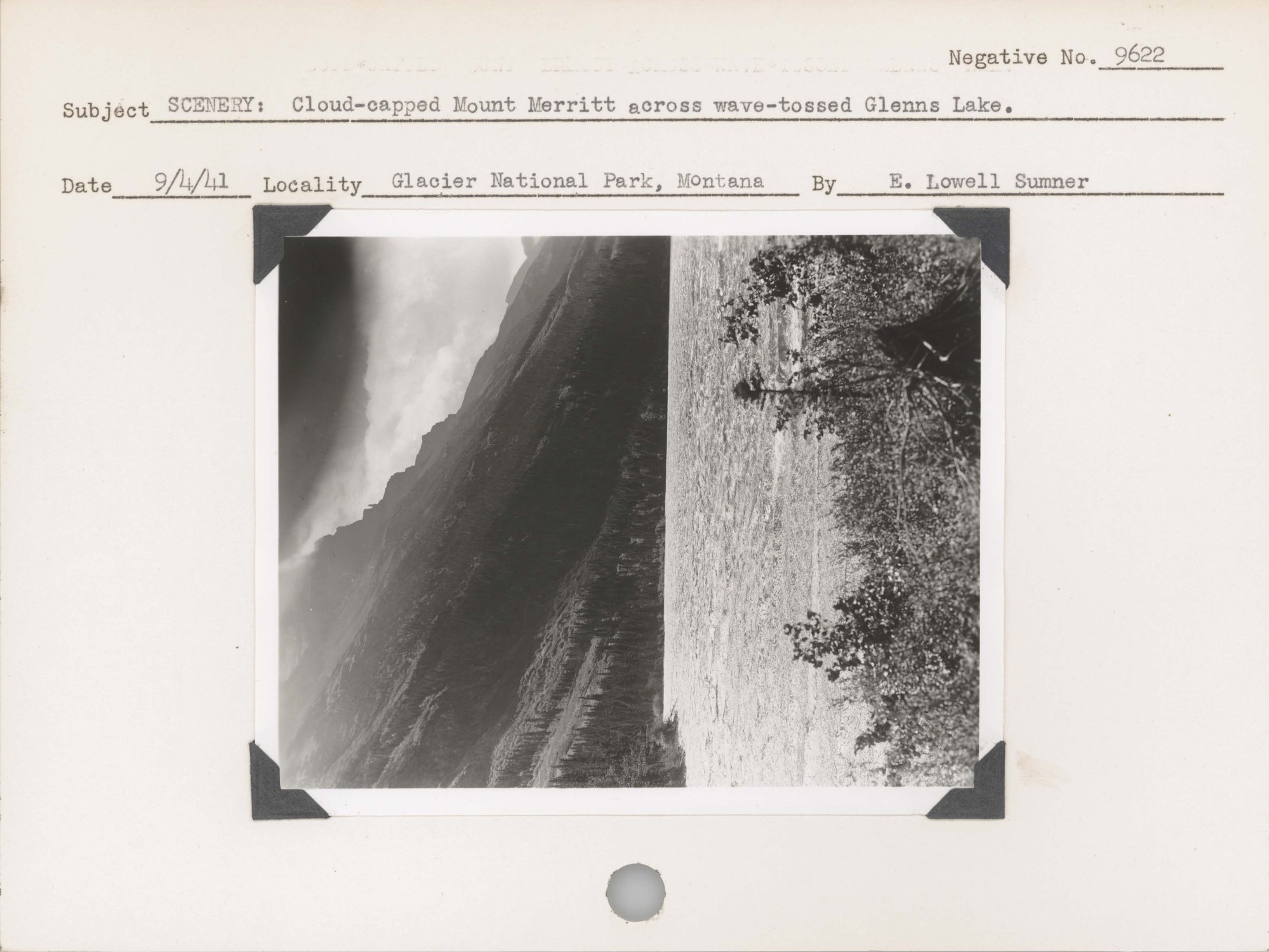 Scenery – Cloud capped Mount Merritt across wave-tossed Glenns Lake. Negative #: 9622. Locality: Glacier National Park, Montana.