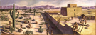 Conjectural prehistoric village scene of the Hohokam in the 14th century AD. Illustration depicts lifestyle activity of the Hohokam both within and outside the structure in a landscape typical of late June with morning light.