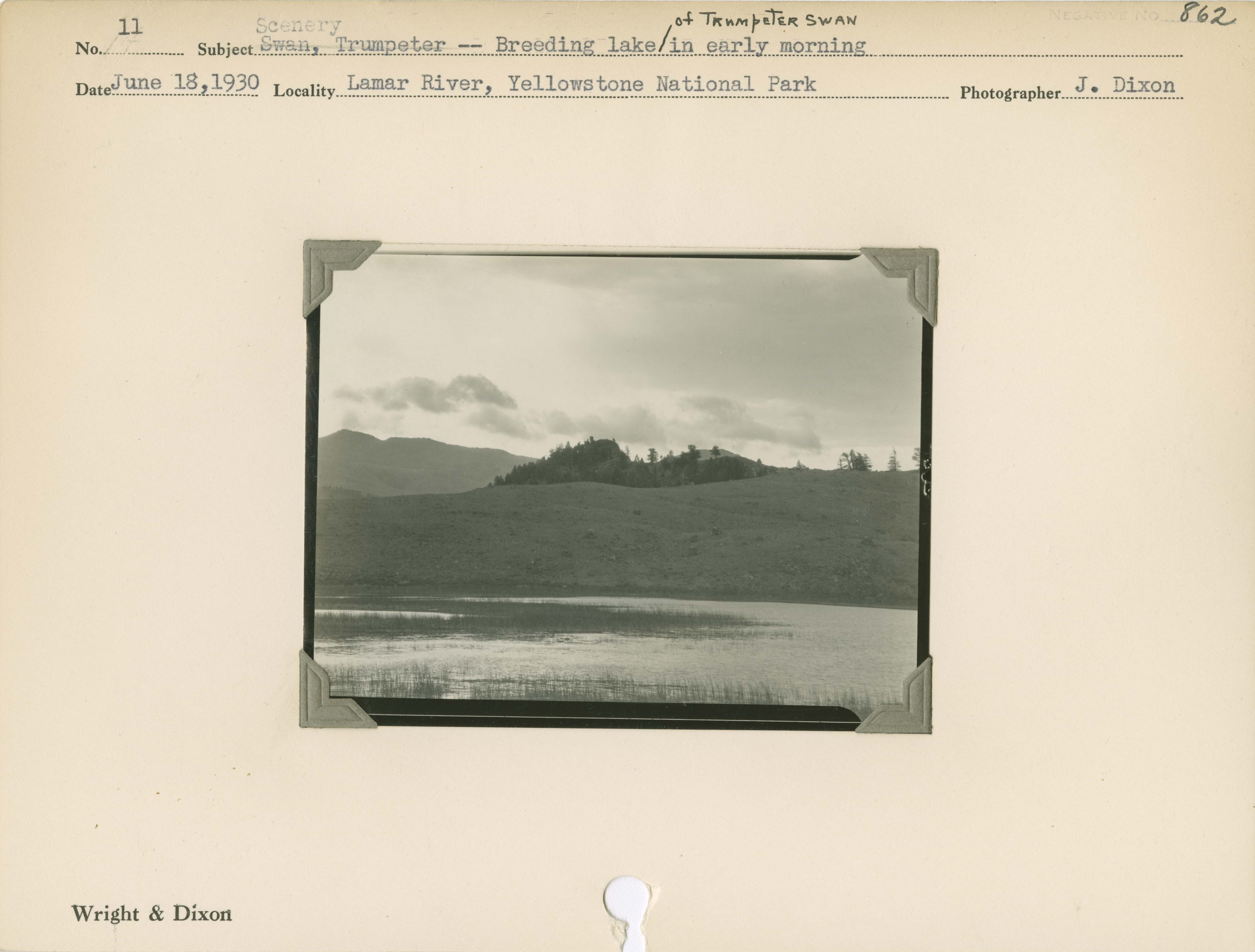 Swan, Trumpeter -- Breeding lake of Trumpeter Swan in early morning. Locality: Lamar River, Yellowstone National Park. Negative #: 862
