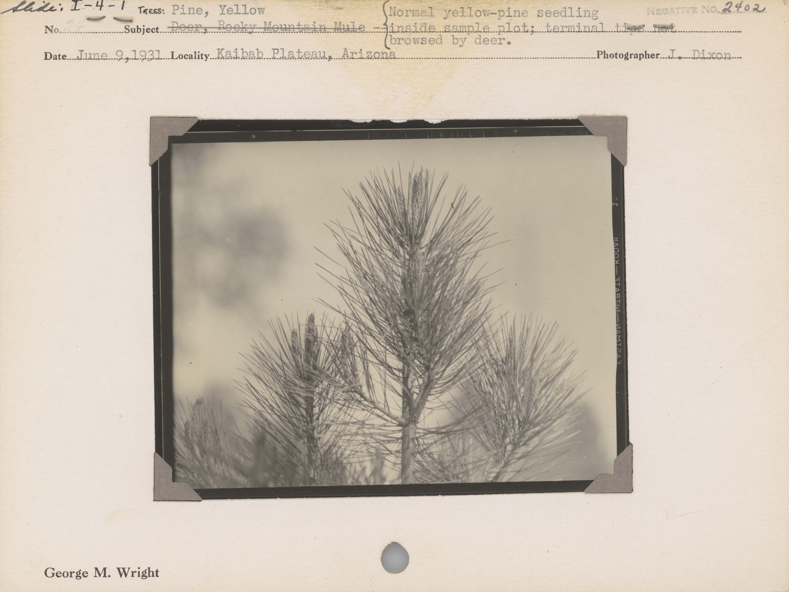 Pine, Yellow – Normal yellow-pine seedling inside sample plot; terminal tips not browsed by deer. Negative #: 2402. Locality: Kaibab Plateau, Arizona.