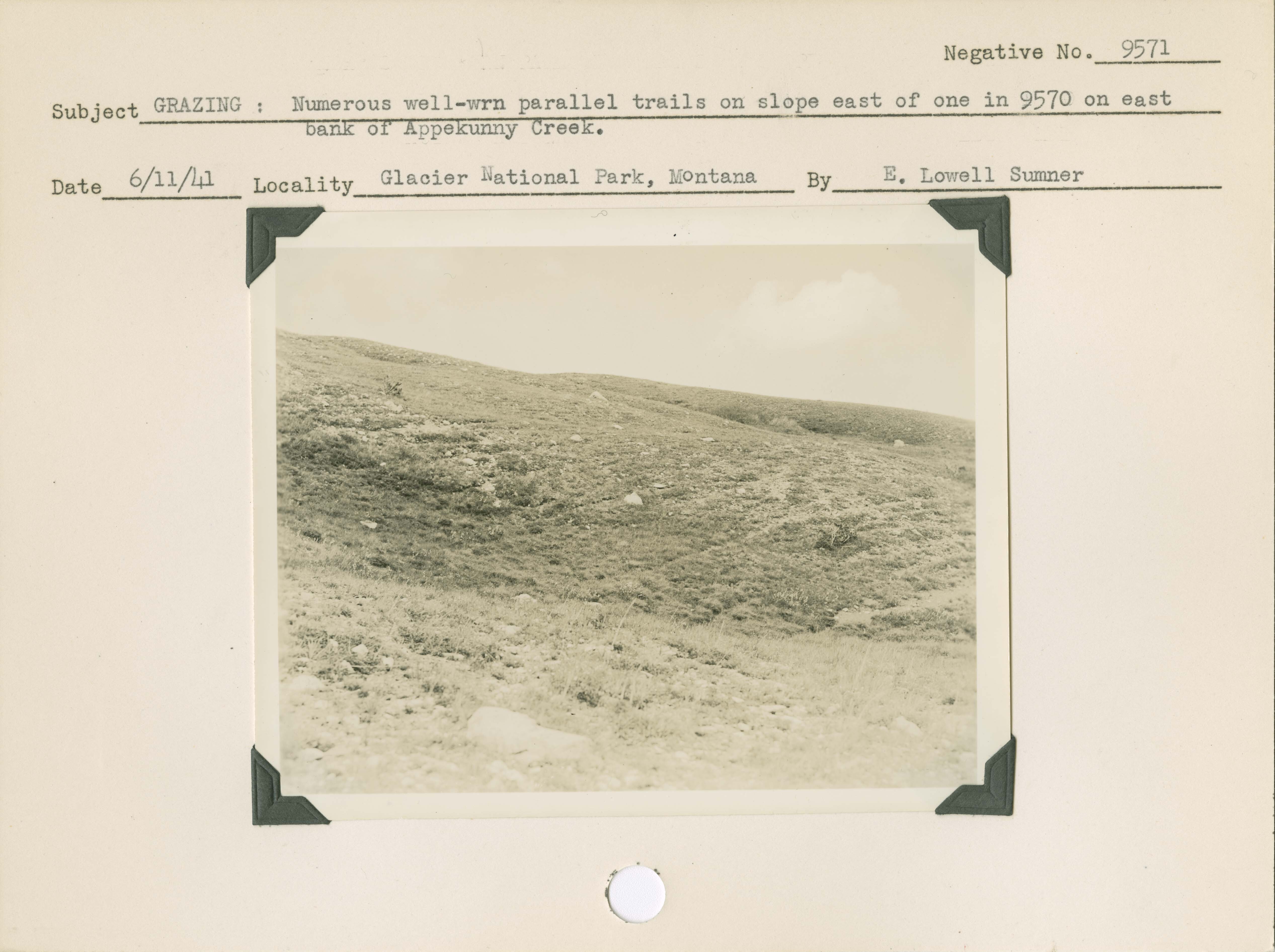 Grazing: Numerous well-worn parallel trails on slope east of one in negative number 9570 on east bank of Appekunny Creek. . Locality: Glacier National Park, Montana. Negative #: 9571
