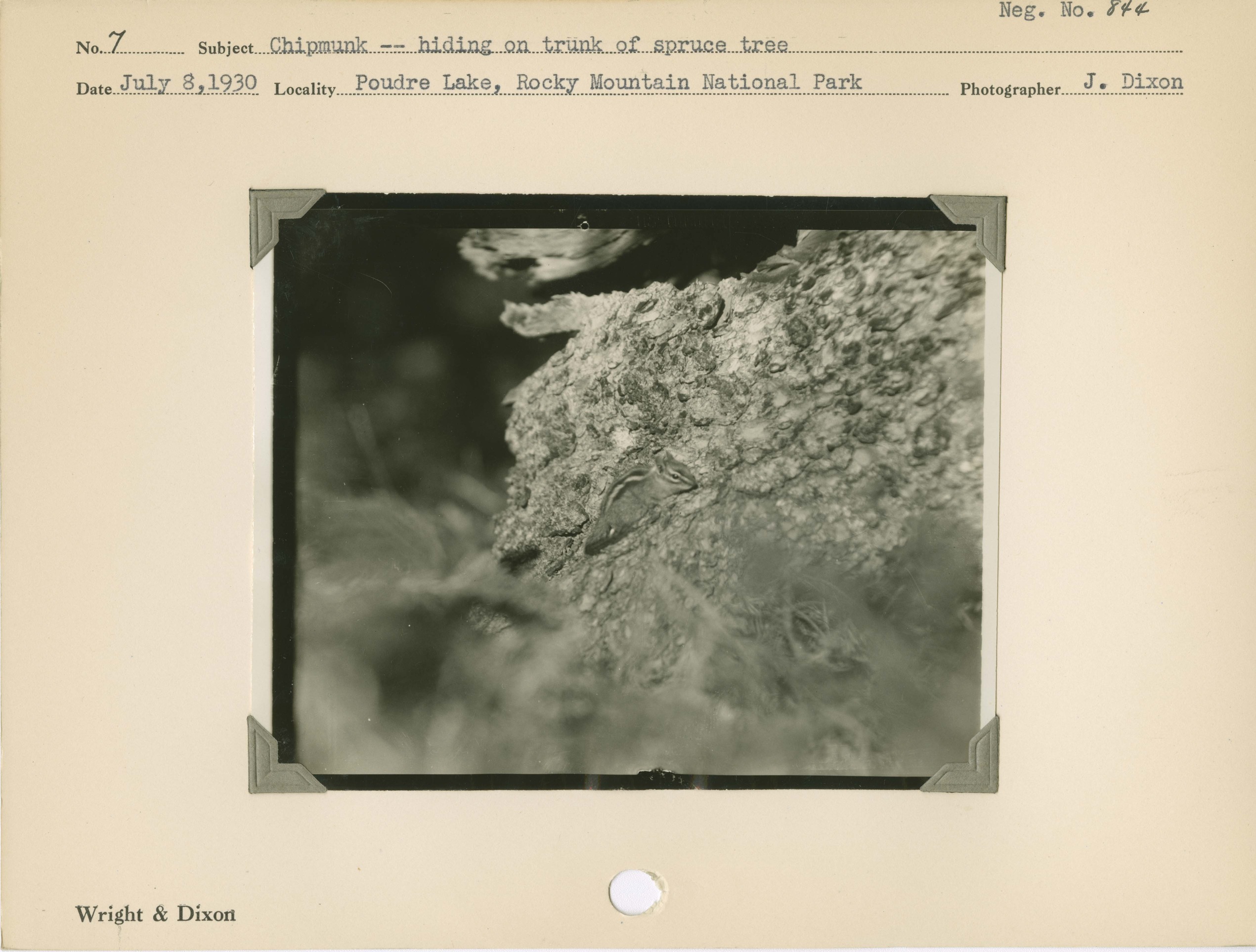 Chipmunkāhiding on trunk of spruce tree. Locality: Poudre Lake, Rocky Mountain National Park. Negative #: 844
