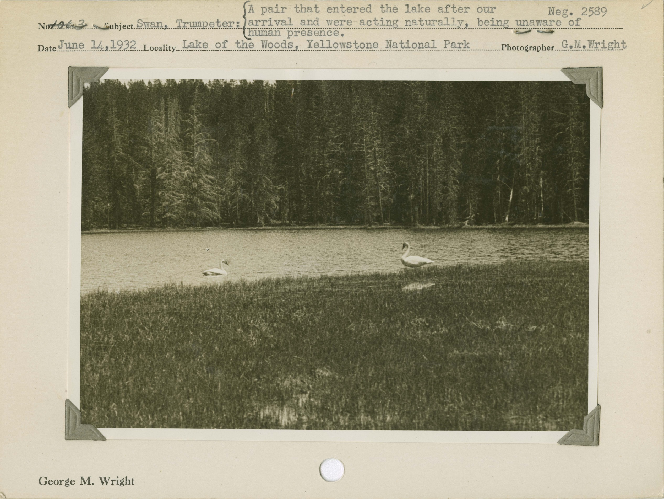 Swan, Trumpeter: A pair that entered the lake after our arrival and were acting naturally, being unaware of human presence. Locality: Lake of the Woods, Yellowstone National Park. Negative #: 2589