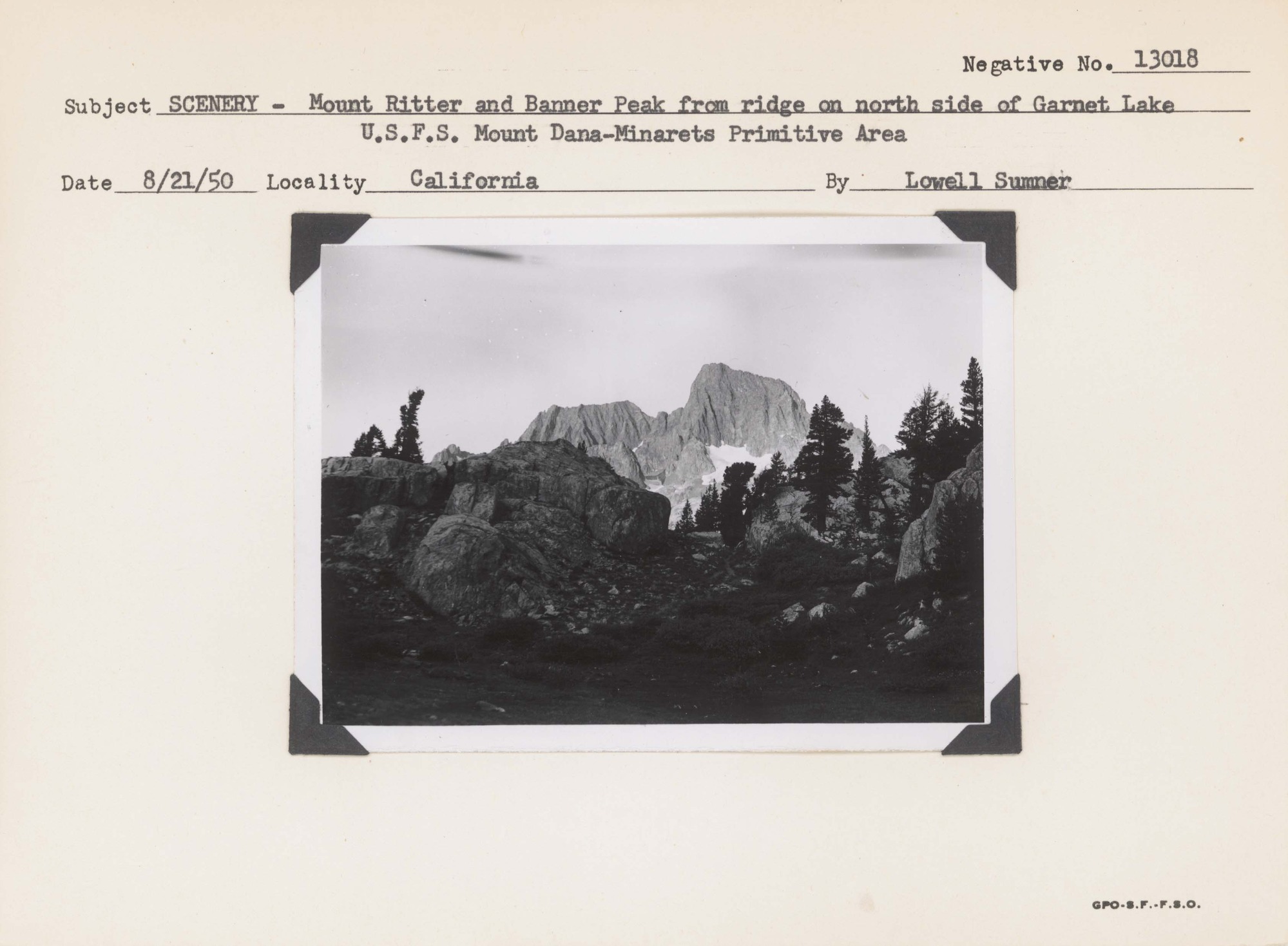 Scenery – Mount Ritter and Banner Peak from ridge on north side of Garnet Lake. United States Forest Service Mount Dana -Minarets Primitive Area. Negative #: 13018. Locality: California