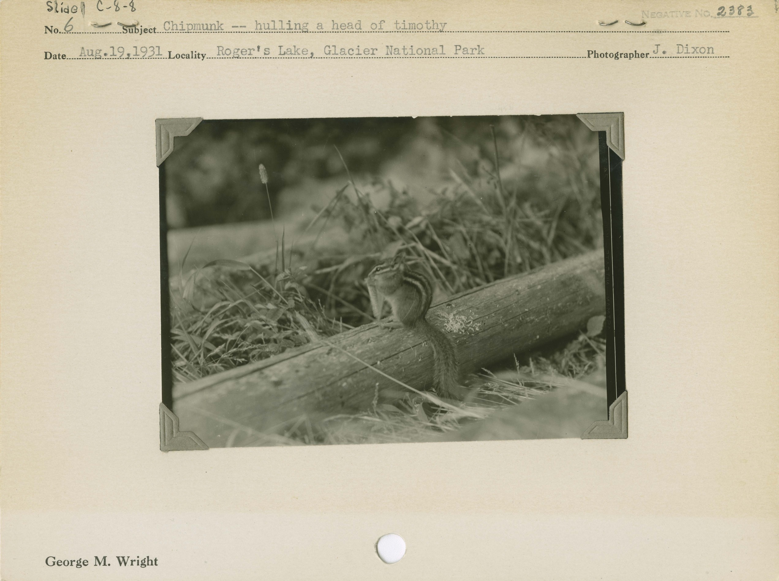 Chipmunk – hulling a head of timothy. Locality: Roger’s Lake, Glacier National Park. Negative #: 2383