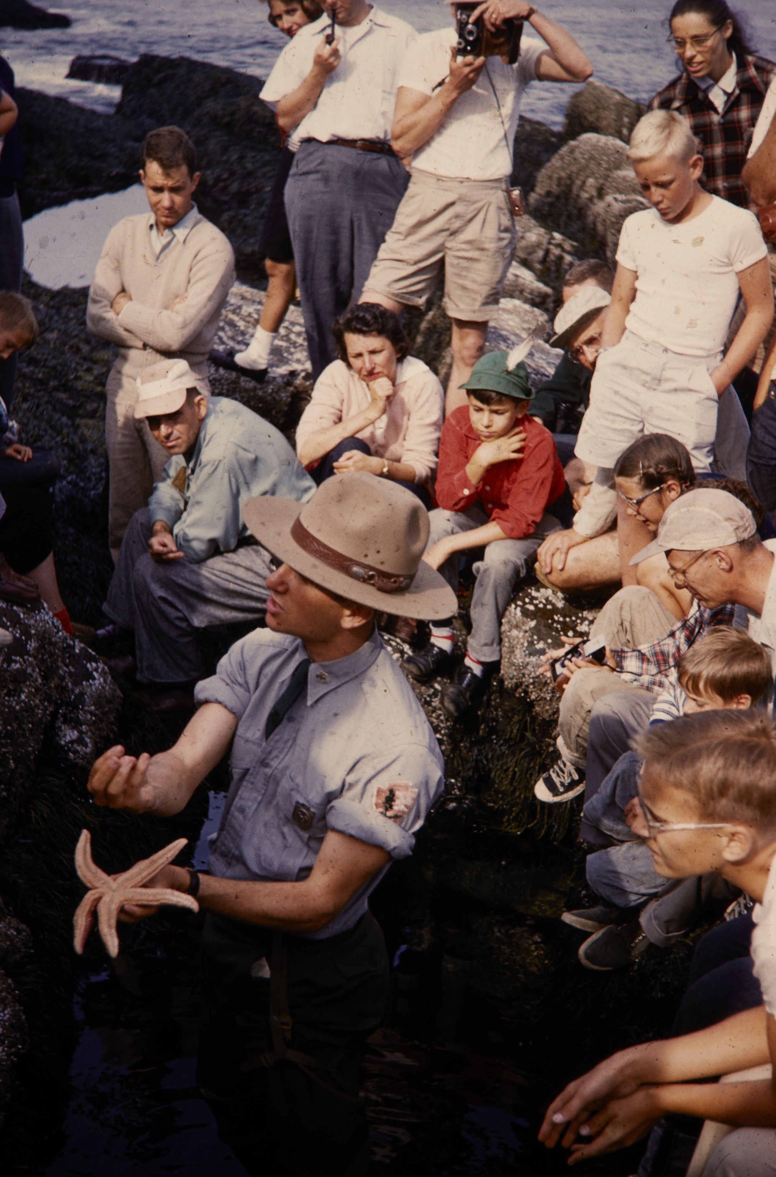 NPS employee talking to visitors while holding a starfish in Acadia National Park.