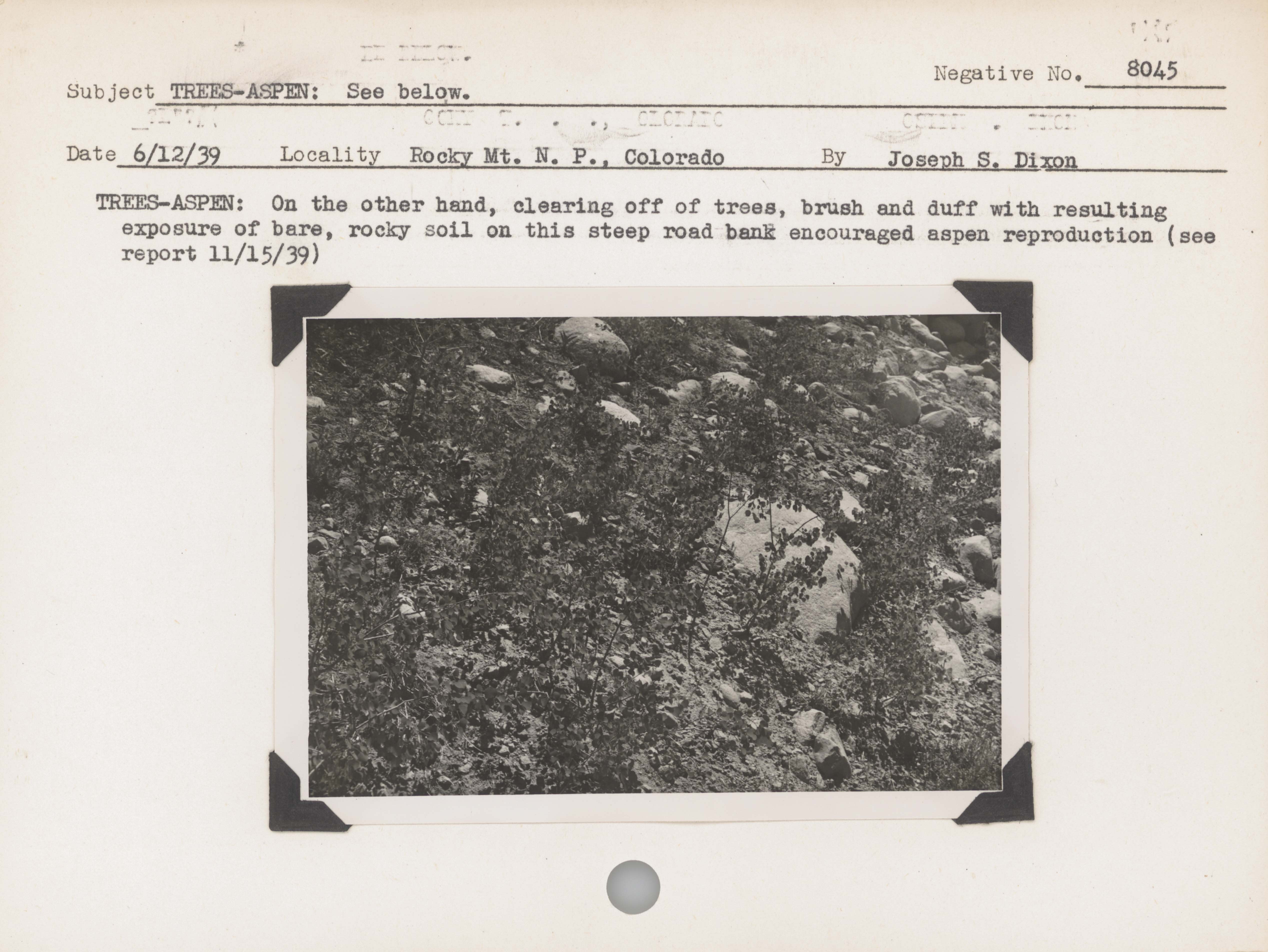 Tree – Aspen: On the other hand, clearing off trees, brush and duff with resulting exposure of bare, rocky soil on this steep road bank encouraged aspen reproduction (see report 11/15/39). Negative #: 8045. Locality: Rocky Mountain National Park, Colorado.