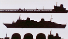 Silhouette of Passenger Liner (center). Partially shown is silhouette of a Tanker (top).