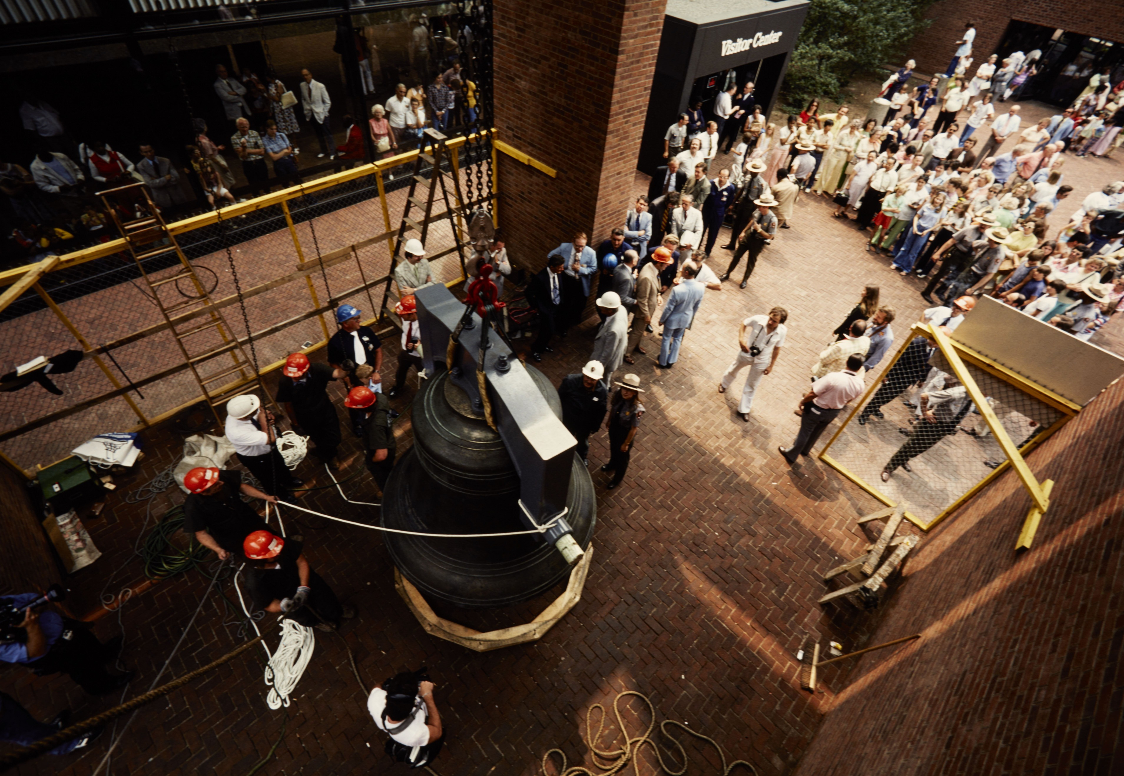 Aerial view of visitors and NPS employees watching a bell being raised into position in Independence National Historical Park.
