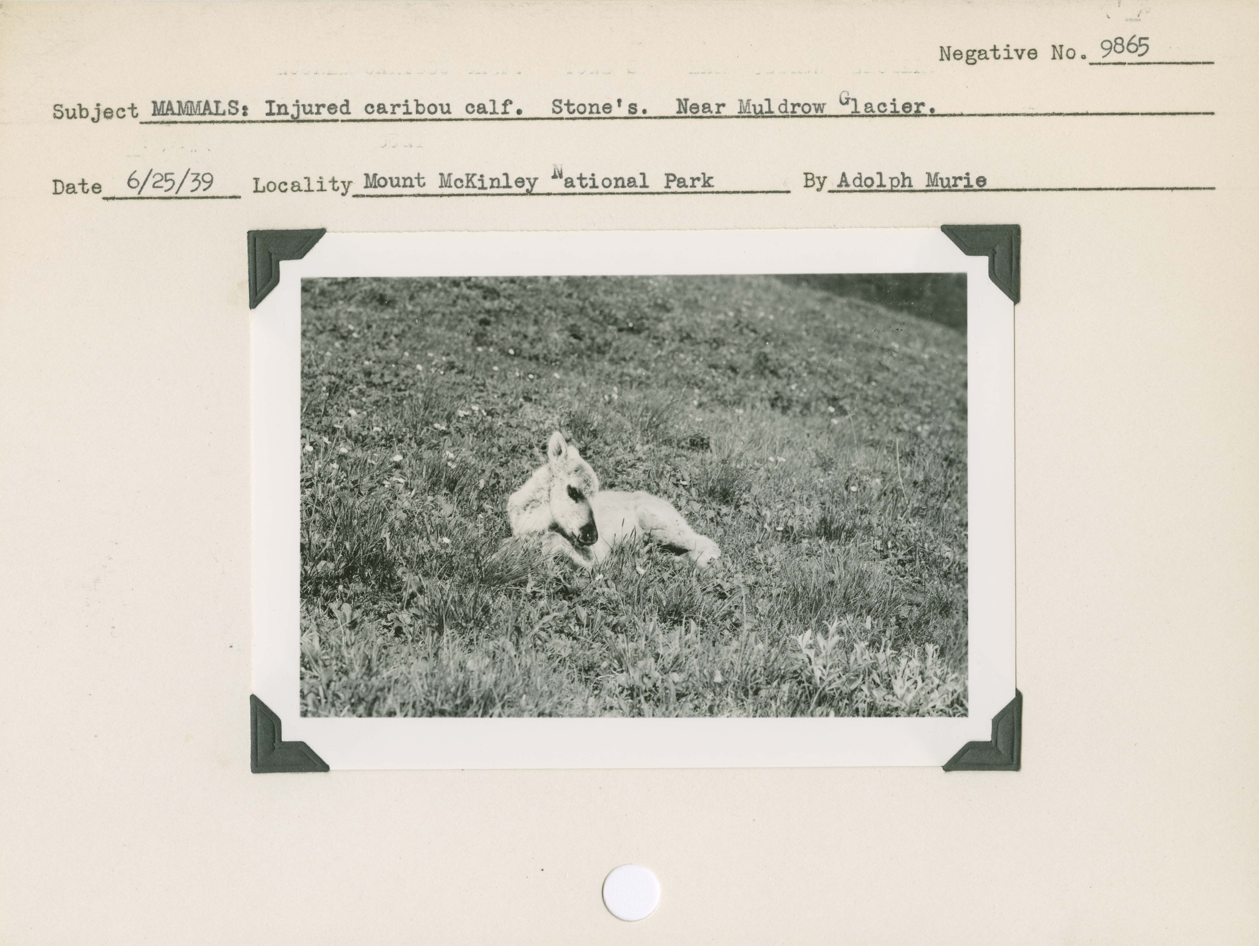 Mammals: Injured caribou calf. Stone’s. Near Muldrow Glacier. Locality: Mount McKinley [Denali] National Park. Negative #: 9865.