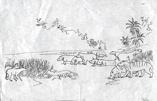 Outlines for identification of prehistoric animals: Phenacodus, Coryphodon, Huracotherium as seen in full color painting of Eocene landscape at Big Bend National Park, Graphic #17-5.