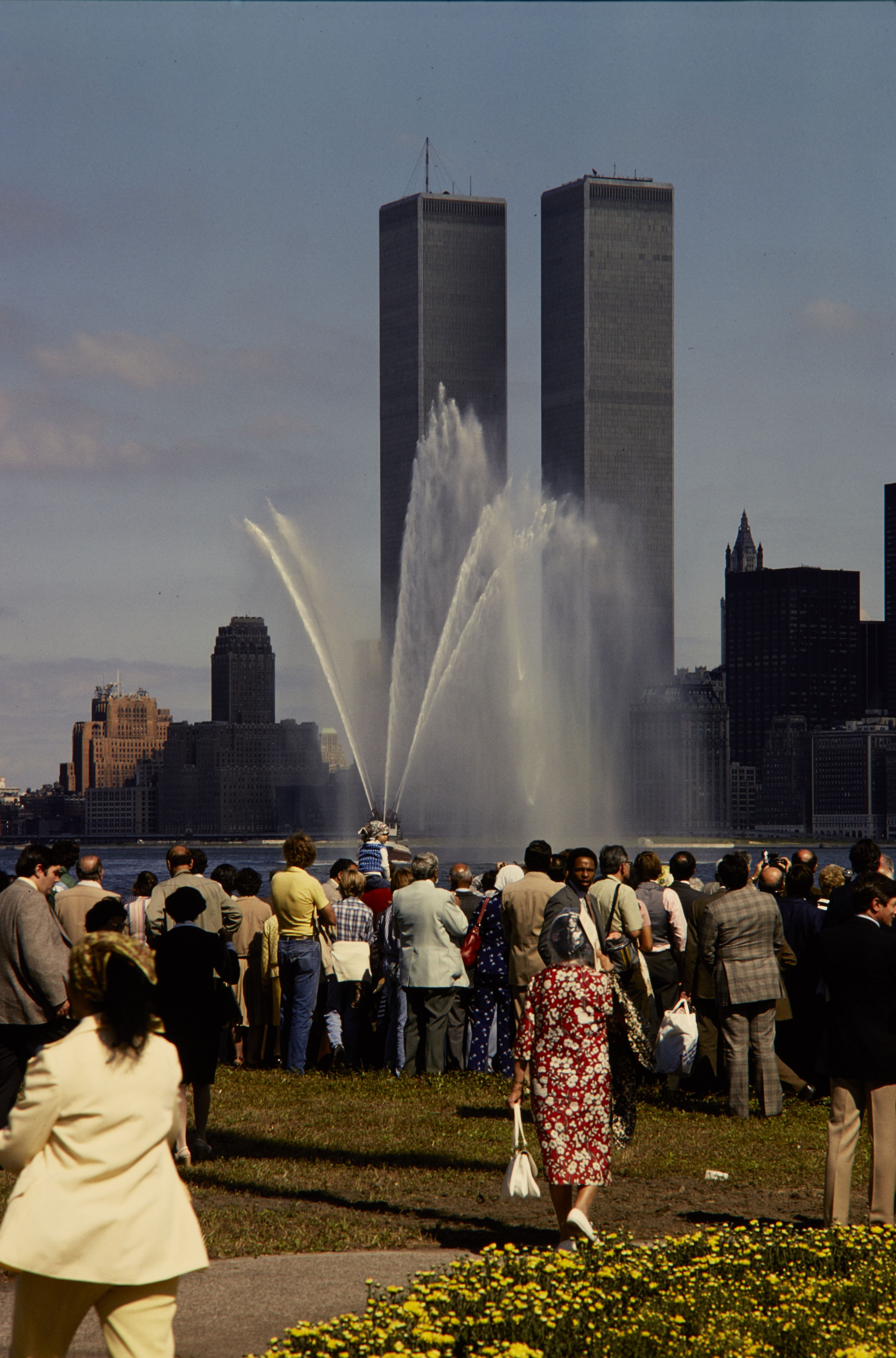 Visitors looking at a boat shotting off water with the twin towers in the background at Gateway National Recreation Area.