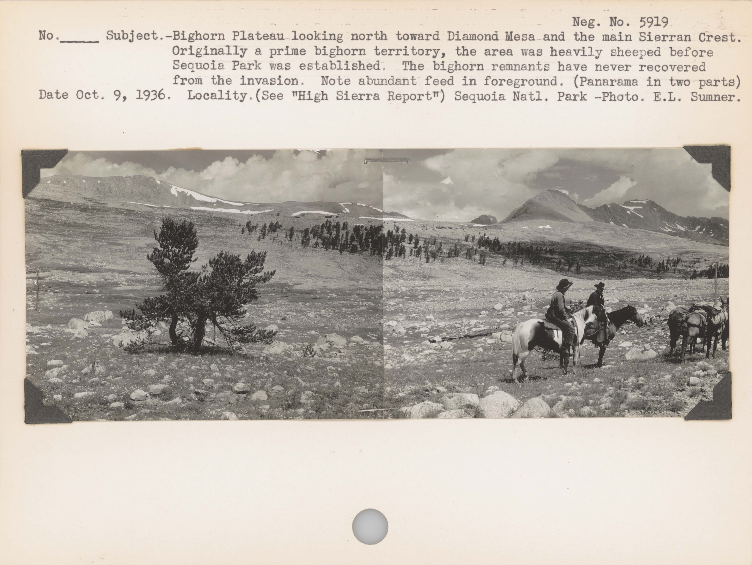 Bighorn Plateau looking north toward Diamond Mesa and the main Sierran Crest. Originally a prime bighorn territory, the area was heavily sheeped before Sequoia Park was established. The bighorn remmants have never recovered from the invasion. Note abundant feed in foreground. Locality: Sequoia National Park [Sequoia and Kings Canyon National Parks]. Negative #: 5919. (Panarama in two parts) (See "High Sierra Report").