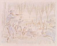 United States soldiers firing on Nez Perce camp along the North Fork Big Hole River during the Battle of The Big Hole.