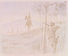 A United States soldier, behind a tree, shooting the Nez Perce warrior Natalekin, signaling the start of the Battle of The Big Hole.