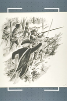 Scene depicts Colonel John Sevier's men (frontiersmen) from the Overmountain regiment under fire while working their way up Kings Mountain.