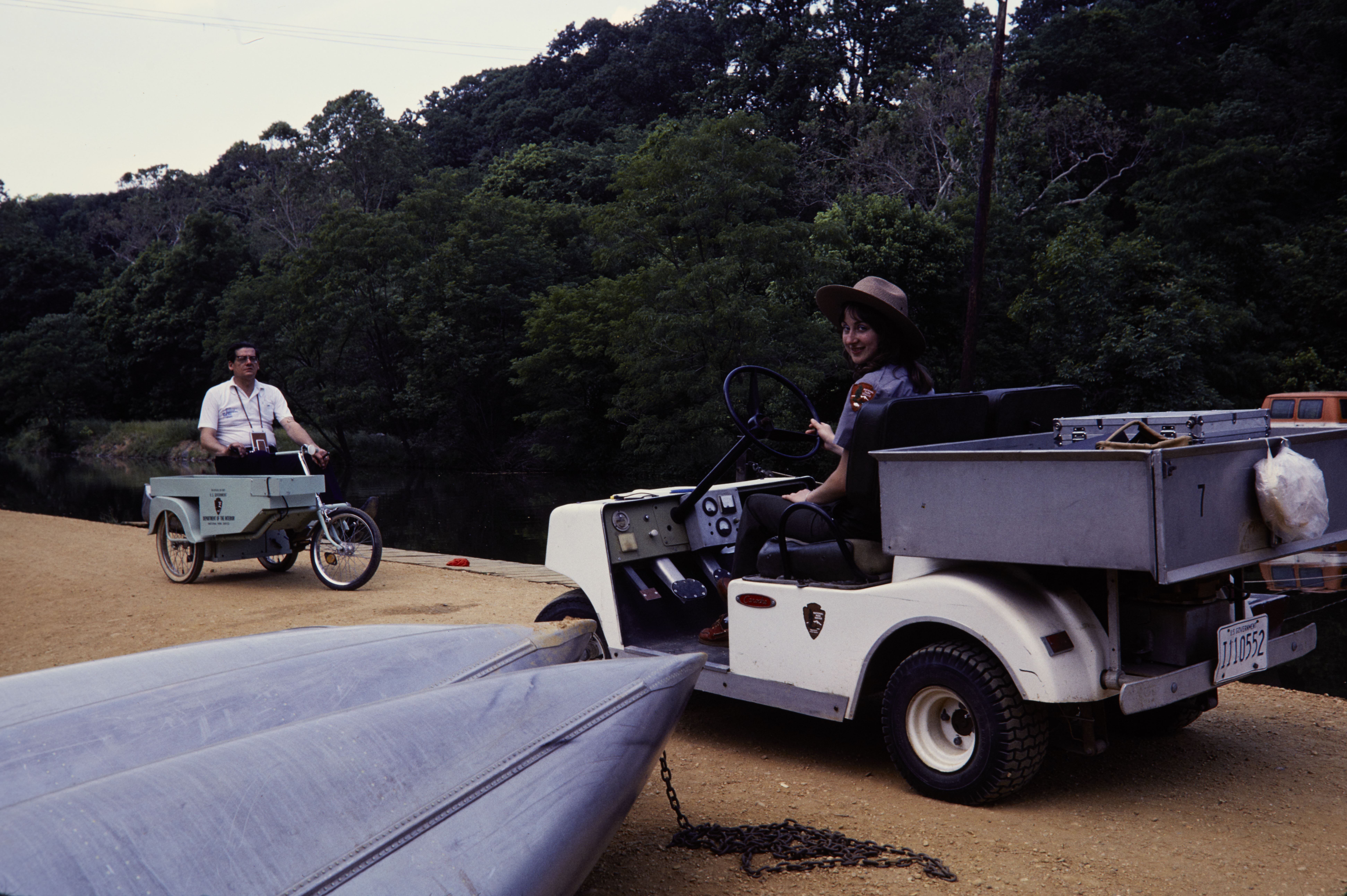 NPS Employee, Anne Brooks, in a vehicle with another NPS employee driving another NPS vehicle at the Chesapeake and Ohio Canal National Historical Park.