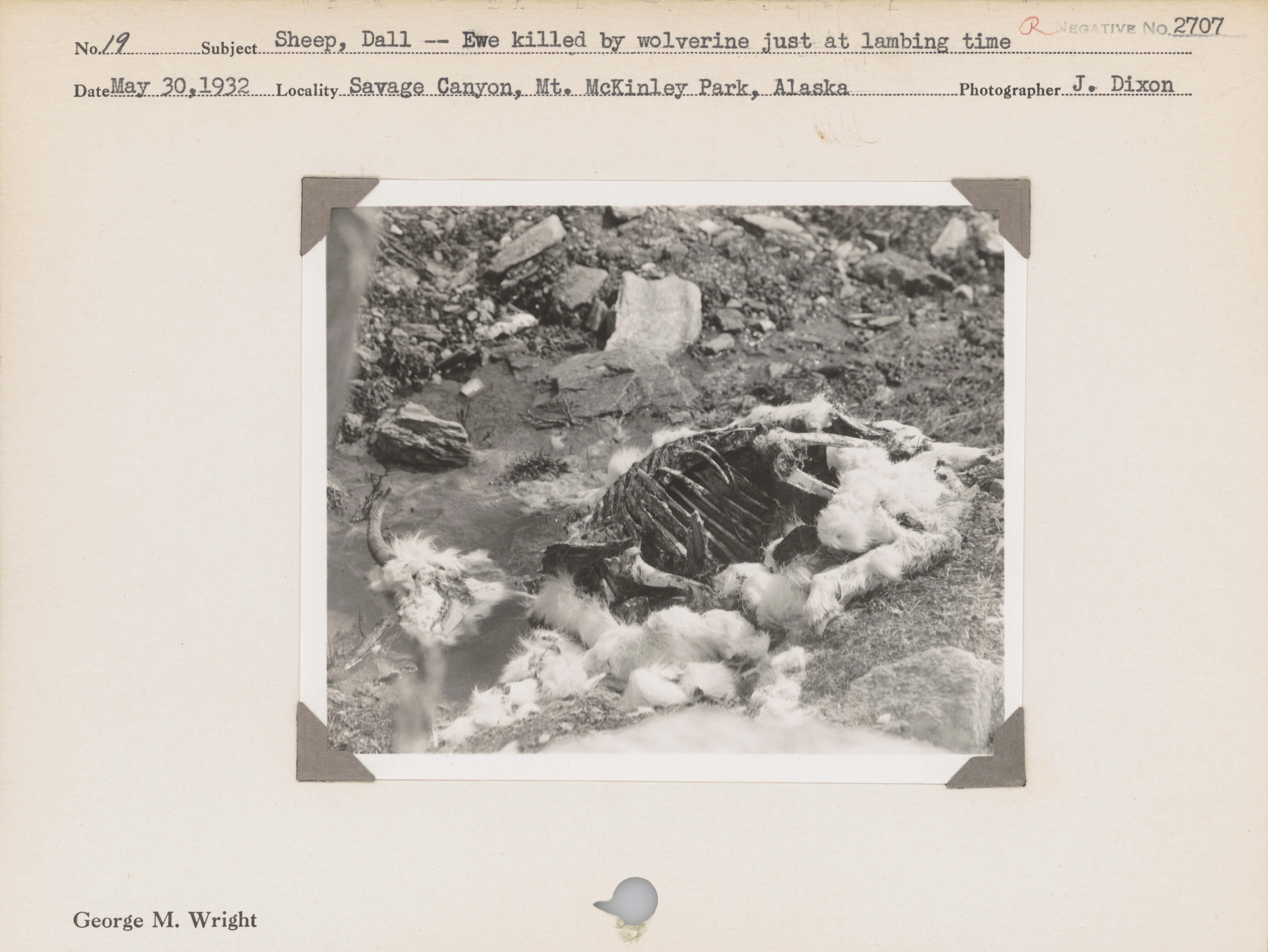 Sheep, Dall--Ewe killed by wolverine just at lambing time. Locality: Savage Canyon, Mount McKinley Park, Alaska [Denali National Park & Preserve]. Negative #: 2707