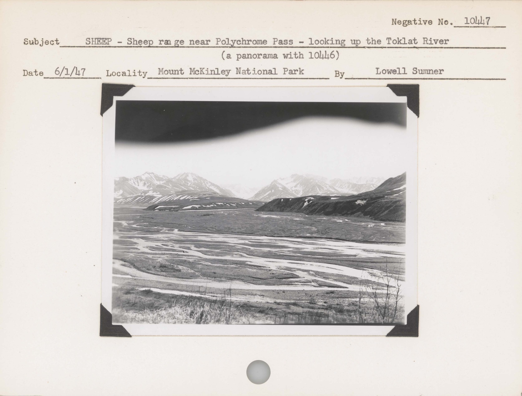Sheep--Sheep range near Polychrome Pass--looking up the Toklat River. Locality: Mount McKinley National Park [Denali National Park & Preserve]. Negative #: 10447. (a panorama with negative #10446)