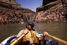 NPS Director William Whalen's Colorado River float trip in Grand Canyon National Park. River patrol S. Martin rowing.