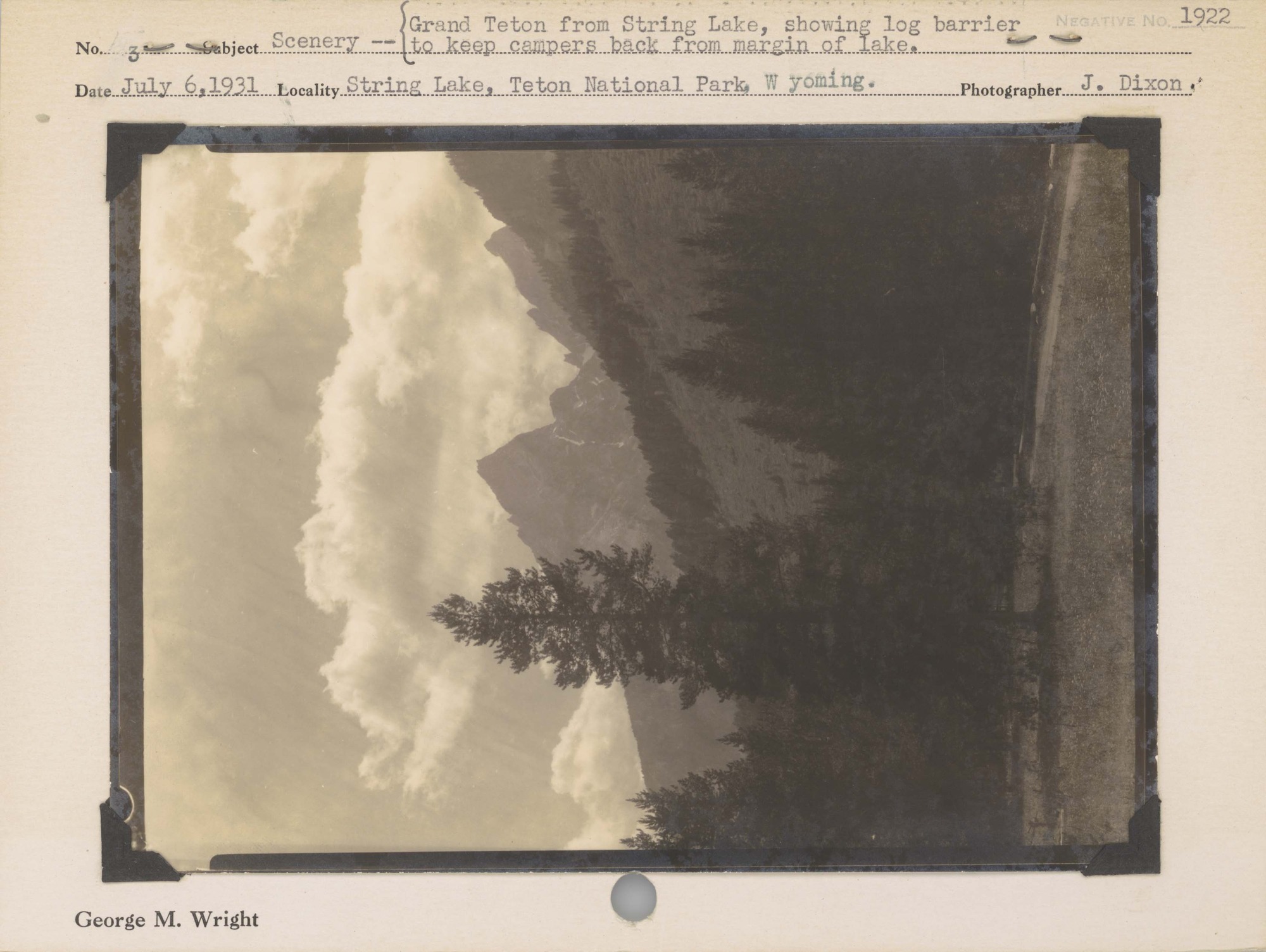 Scenery: Grand Teton from String Lake, showing log barrier to keep campers back from margin of lake. Negative #: 1922. Locality: String Lake, Grand Teton National Park, Wyoming.