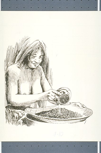Native American Indian woman preparing Manzanita cider by straining the pulp through a basket.